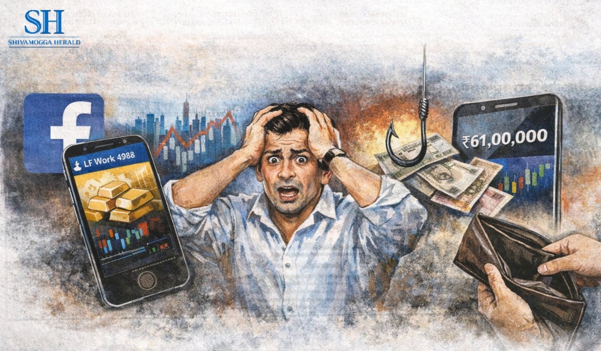 ಶಿವಮೊಗ್ಗ:’ನಗರದ ವ್ಯಕ್ತಿಯೊಬ್ಬರು ಫೇಸ್ಬುಕ್ನಲ್ಲಿ ಕಂಡ ಆಕರ್ಷಕ ಜಾಹೀರಾತನ್ನು ನಂಬಿ ಚಿನ್ನ ಹಾಗೂ ಷೇರು ಮಾರುಕಟ್ಟೆಯಲ್ಲಿ ಹೂಡಿಕೆ ಮಾಡುವ ಹೆಸರಿನಲ್ಲಿ ₹61 ಲಕ್ಷ ಕಳೆದುಕೊಂಡಿರುವ ಘಟನೆ ನಡೆದಿದೆ. ಸಿಇಎನ್ (CEN) ಪೊಲೀಸ್ ಠಾಣೆಯಲ್ಲಿ ಪ್ರಕರಣ ದಾಖಲಾಗಿದೆ.